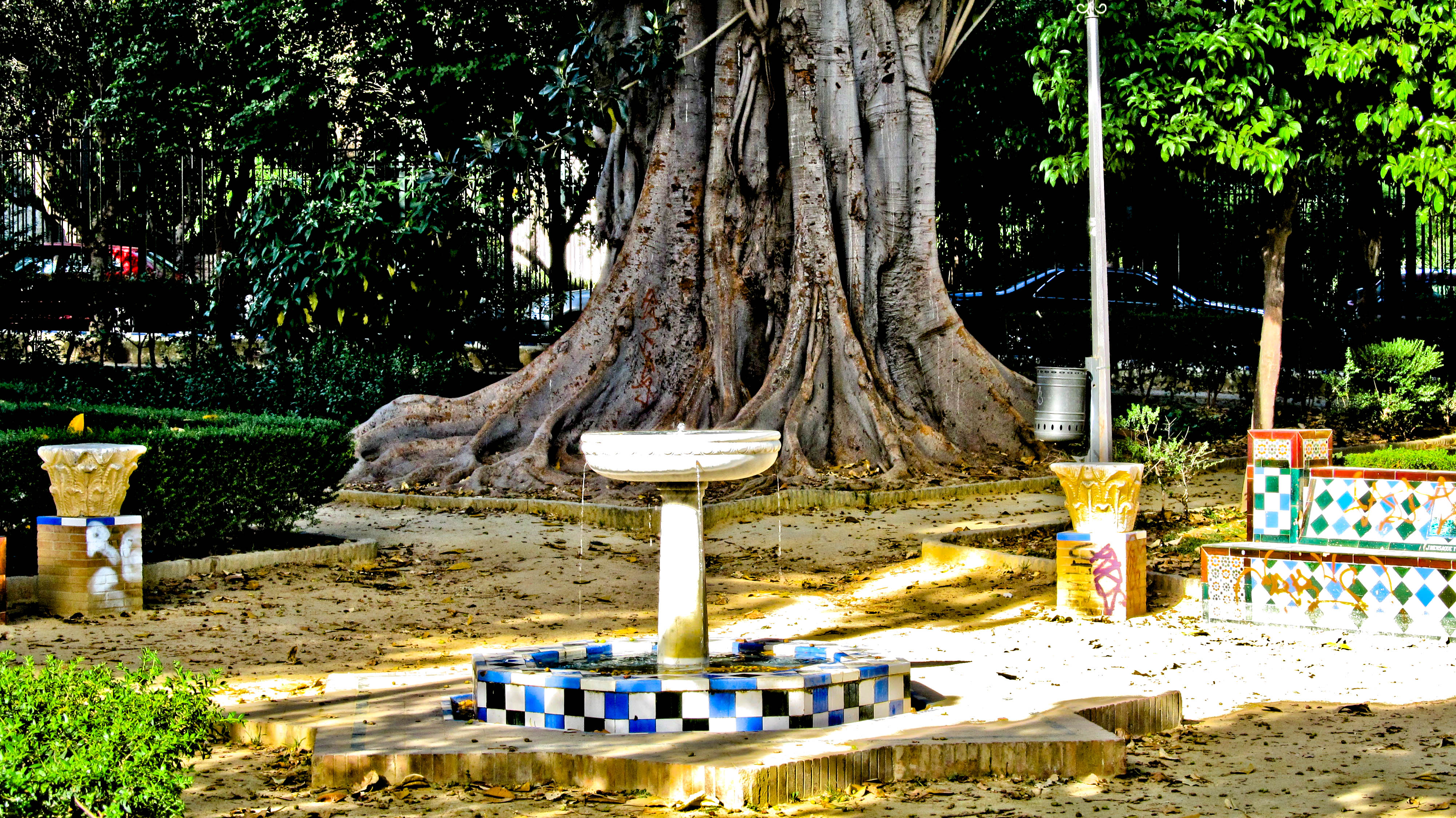 Pour vous rendre dans les jardins de Murillo il faut sortir de l’université par l’entrée principale et se diriger sur la droite, à l’angle de la rue San Fernando au niveau de la station de location de vélo, tournez sur la gauche et entrez dans le parc. Les jardins de Murillo ne sont pas un passage obligé mais plutôt que de passer sur une route goudronnée autant passer dans un parc au calme, non? Admirez ses arbres centenaires et prenez le temps de vous asseoir sur l’un des bancs en face d’une fontaine pour faire le vide autour de vous.